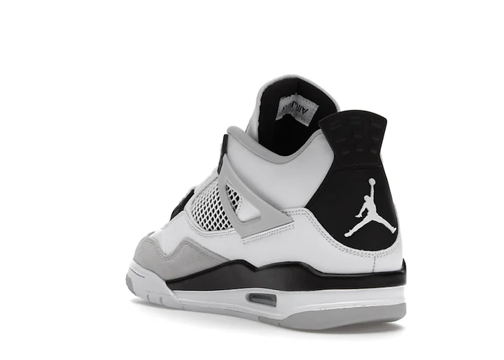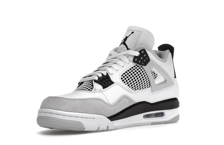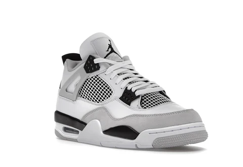 Pulling its color-blocked style from the Air Jordan 4 Military Blue, the Air Jordan 4 Military Black features a smooth white leather upper with a light grey Durabuck toe wrap and netted TPU inserts. Military Black eyelets, heel tabs, and underlays add a stark contrast to the upper. At the base, a white, black, and light grey sole with a visible Air unit completes the design.